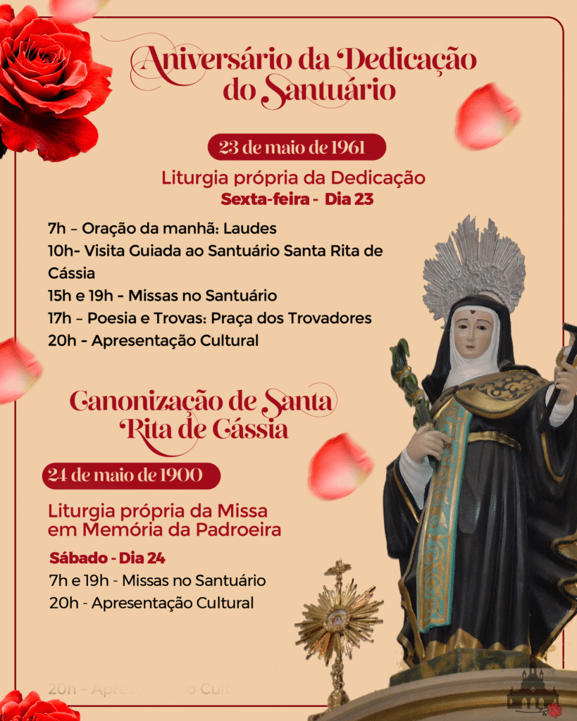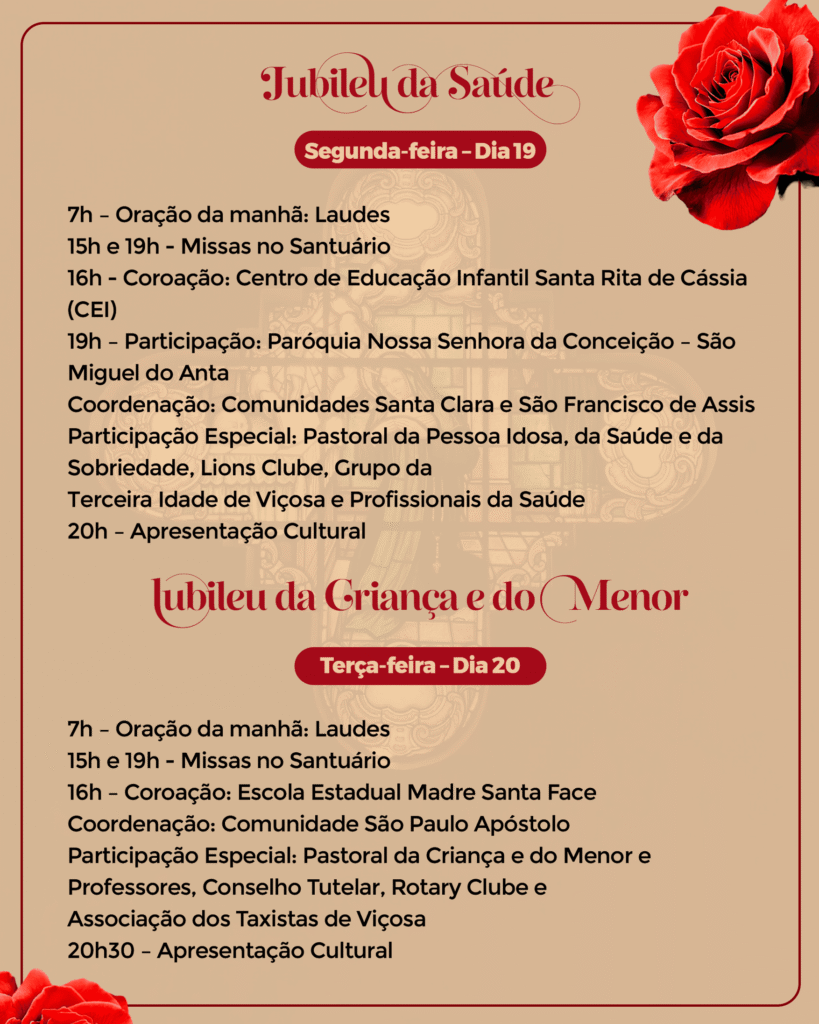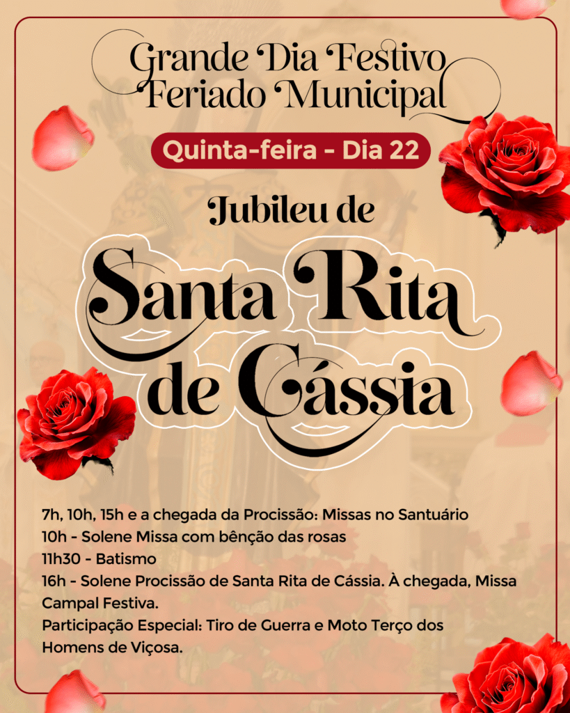 As celebrações jubilares trazem momentos de oração, novenas, bênçãos, confissões e missas solenes, reunindo fiéis de toda a região para louvar a Deus e agradecer pelas graças recebidas. O ponto alto da festa será a Solenidade de Santa Rita de Cássia, no dia 22 de maio, quando as ruas de Viçosa se enchem de e devoção.