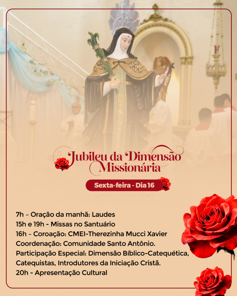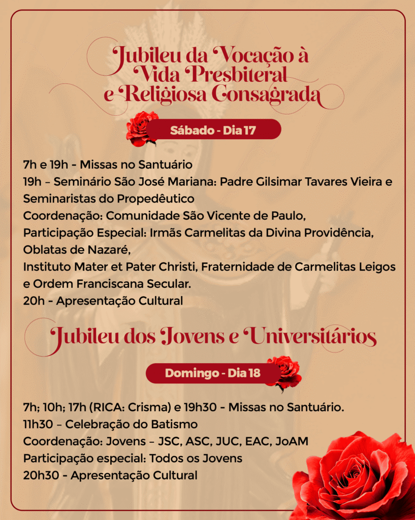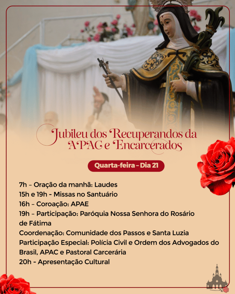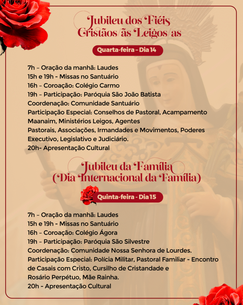 Venha viver conosco este tempo de bênçãos. Participe da programação do Jubileu e fortaleça sua no Cristo crucificado, seguindo o exemplo de Santa Rita, modelo de virtudes e esperança para todos nós.
