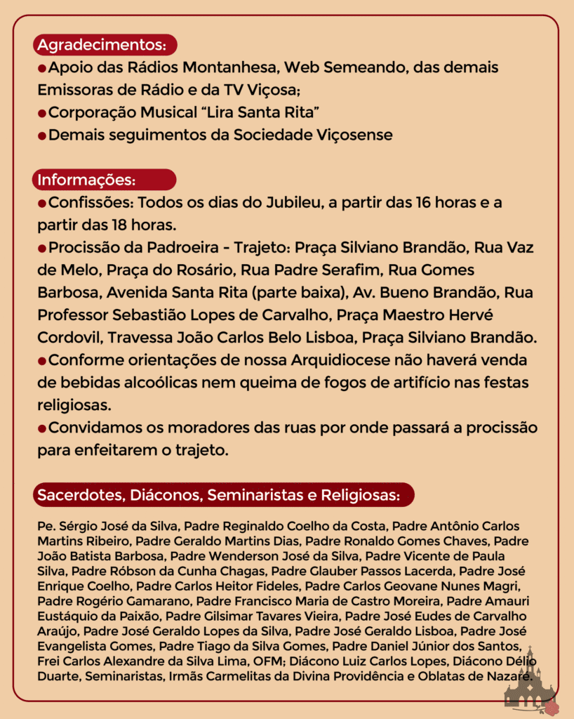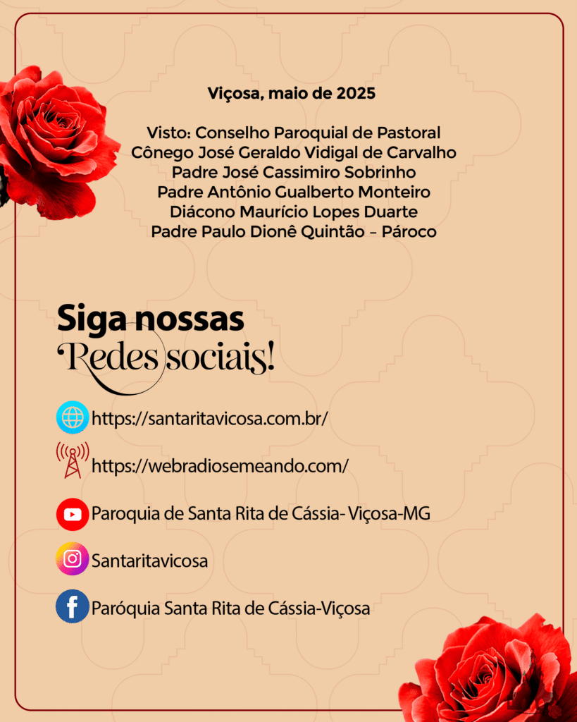 A Paróquia Santa Rita de Cássia, em Viçosa, convida todos os fiéis e devotos a participarem com fervor do Jubileu de nossa padroeira, Santa Rita de Cássia. Este é um tempo de profunda oração, renovação da e encontro com Deus por meio da intercessão daquela que é conhecida como a Santa das Causas Impossíveis.